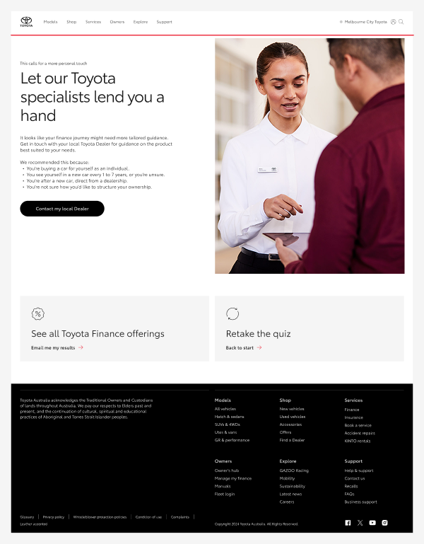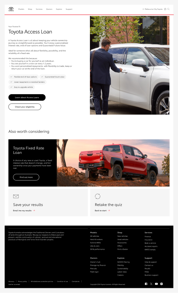 Hero images played an important role across the experience, appearing at the start of the quiz, throughout question screens, and on result and recommendation screens. Images were selected from Toyota's existing brand library, with careful consideration given to how each image reinforced the tone and context of the screen it supported. Selections needed to reflect the financial subject matter of each moment in the quiz, align with Toyota's brand aesthetic, and hold up against accessibility requirements — particularly around contrast when text was placed over or alongside imagery. The result was a visual layer that felt cohesive and considered throughout the full experience, rather than decorative as an afterthought.